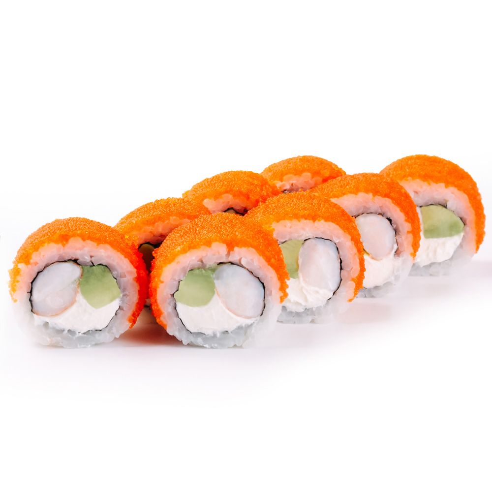 Рис, нори, сыр творожный, авокадо, креветка тигровая, икра летучей рыбы