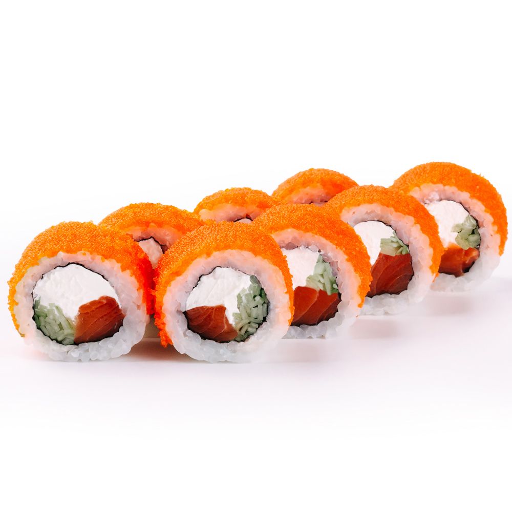 Рис, нори, сыр творожный, огурец, форель, икра летучей рыбы