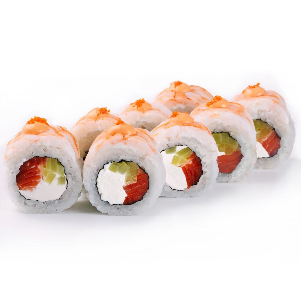 Рис, нори, сыр творожный, дайкон, форель подкопченная, креветка тигровая, икра летучей рыбы, соус «Спайси»