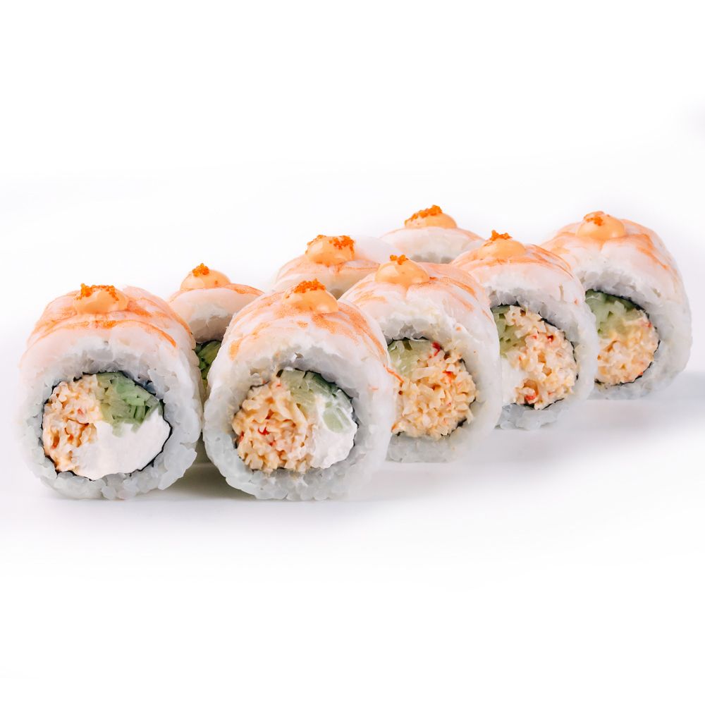 Рис, нори, сыр творожный, огурец, снежный краб, креветка тигровая, икра летучей рыбы, соус «Спайси»