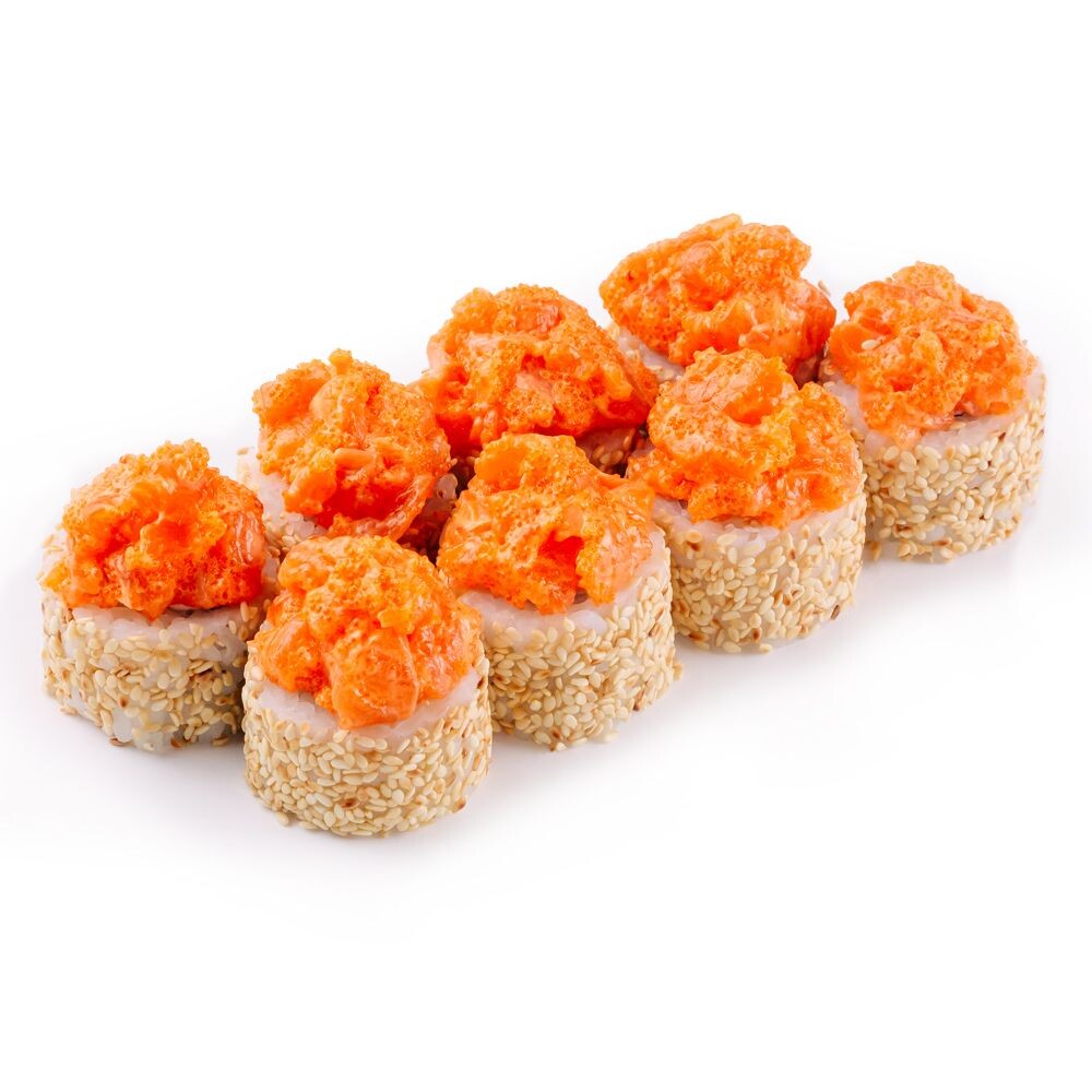 Рис, нори, сыр творожный, дайкон, форель, икра летучей рыбы, кунжут, соус «Спайси»