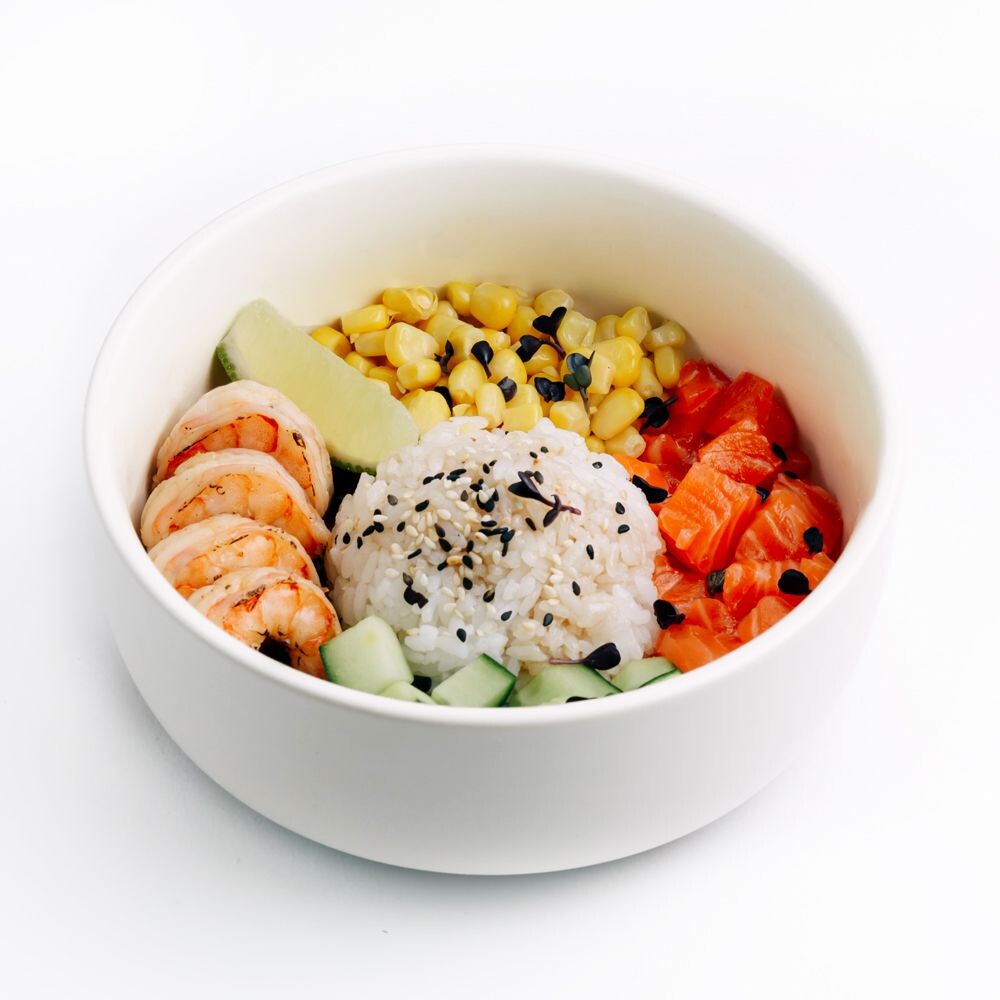 Рис для поке, форель, креветка татаки в азиатском соусе, кукуруза, огурец, лайм, кунжут