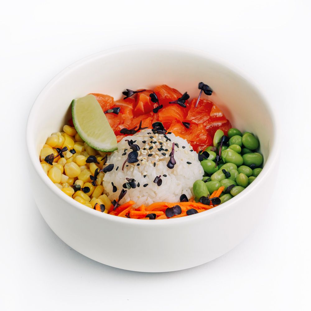 Рис для поке, форель, бобы эдамаме, кукуруза, морковь по-корейски, лайм, кунжут