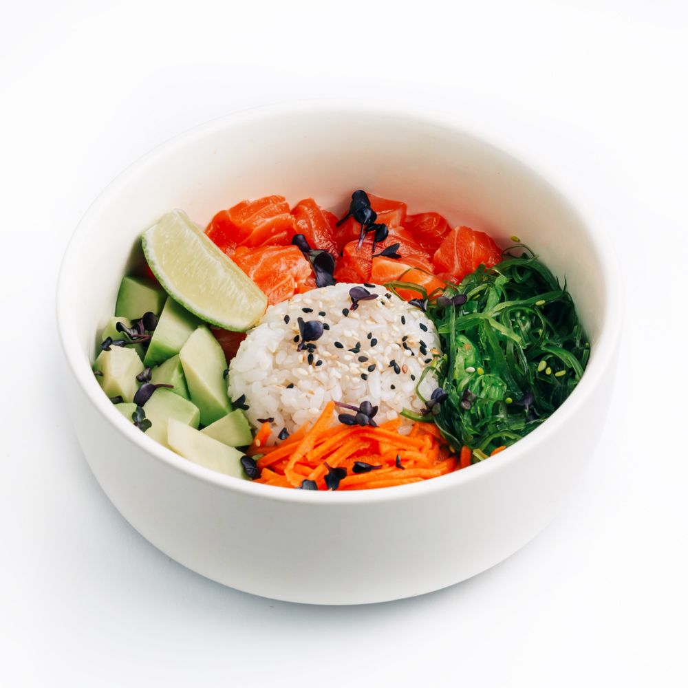 Рис для поке, форель, авокадо, морковь по-корейски, салат чука, лайм, кунжут