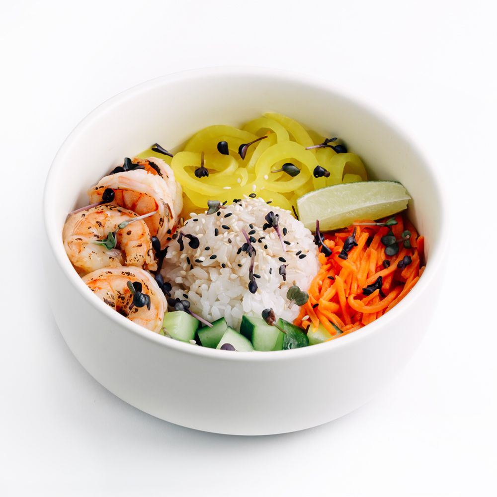 Рис для поке, креветка татаки в азиатском соусе, дайкон, морковь по-корейски, огурец, лайм, кунжут