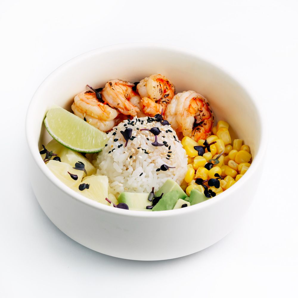 Рис для поке, креветка татаки в азиатском соусе, авокадо, ананас, кукуруза, лайм, кунжут