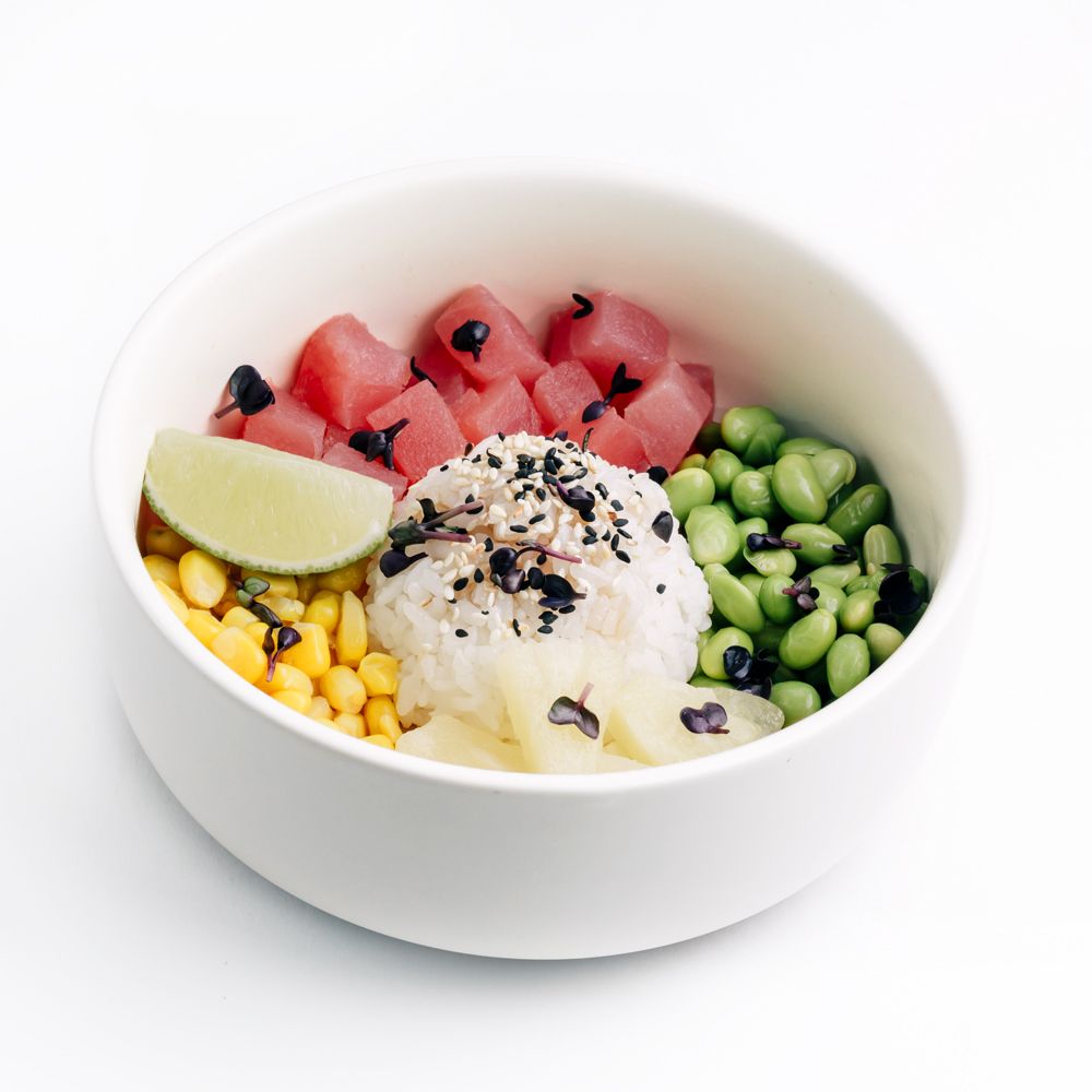 Рис для поке, тунец, ананас, бобы эдамаме, кукуруза, лайм, кунжут