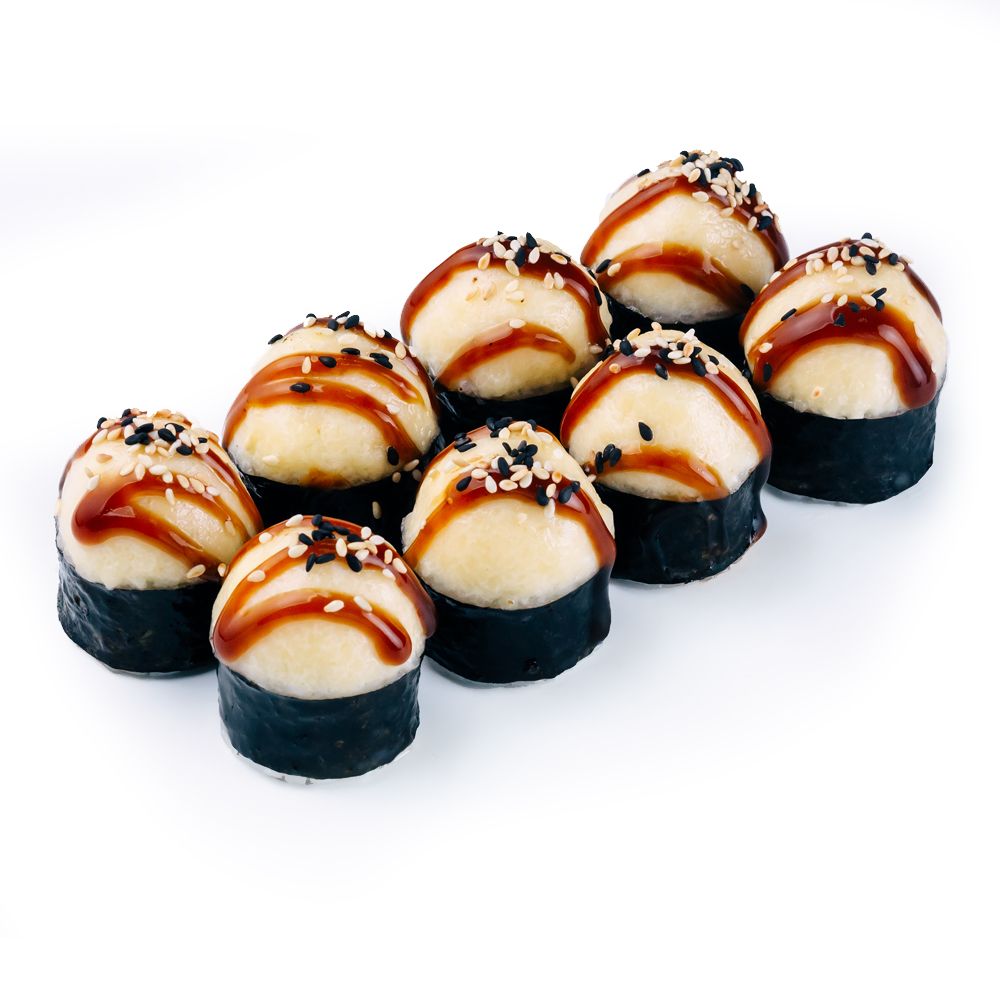 Рис, нори, огурец, сыр творожный, креветка тигровая, майонез, сыр твёрдый, соус «Терияки», кунжут *Роллы из категории «Татаки» не являются запечёнными (тёплыми)