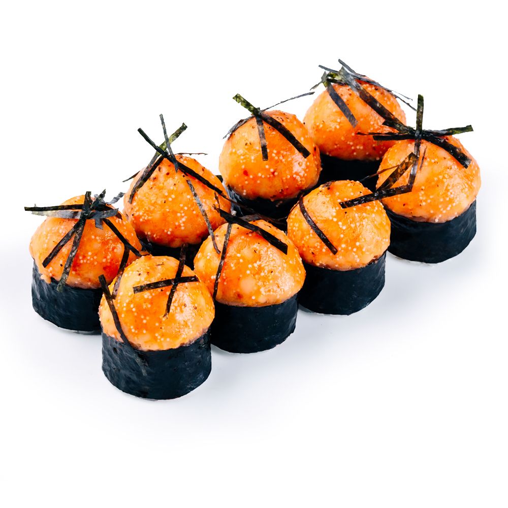 Рис, нори, сыр творожный, дайкон, форель, сыр твёрдый, икра летучей рыбы, соус «Спайси» *Роллы из категории «Татаки» не являются запечёнными (тёплыми) ❗️Состав изменён