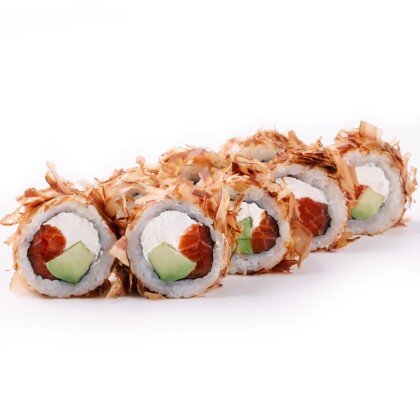 Рис, нори, сыр творожный, авокадо, креветка тигровая, нити чили, соус «Сладкий чили»